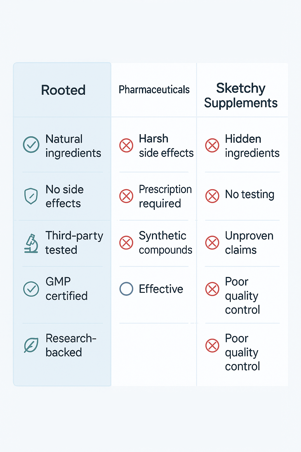 Because your performance and confidence shouldn't be left to chance. Whether you're experiencing occasional concerns or want to maintain peak vitality, Rooted gives you the science-backed support your body needs to perform when it matters most. Unlike harsh pharmaceuticals with unwanted side effects or sketchy "enhancement" products with hidden ingredients, Rooted works with your body's natural systems to restore the robust circulation that powers energy, stamina, and confidence. When you choose Rooted, you're choosing to take control of your vitality naturally, safely, and effectively.