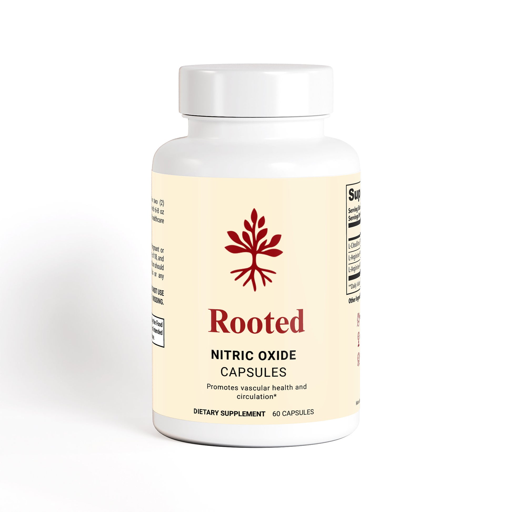 Rooted Nitric Oxide Capsules contain a blend of L-Citrulline and L-Arginine, two amino acids that the body uses to produce nitric oxide. Nitric oxide is a naturally occurring molecule that signals blood vessels to relax and widen, supporting efficient circulation throughout the body. Healthy nitric oxide levels are known to promote cardiovascular function, nutrient delivery, and physical endurance. Rooted provides key building blocks that help maintain optimal nitric oxide activity for overall vascular health.